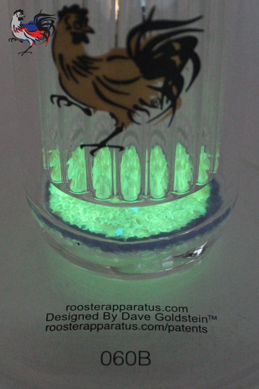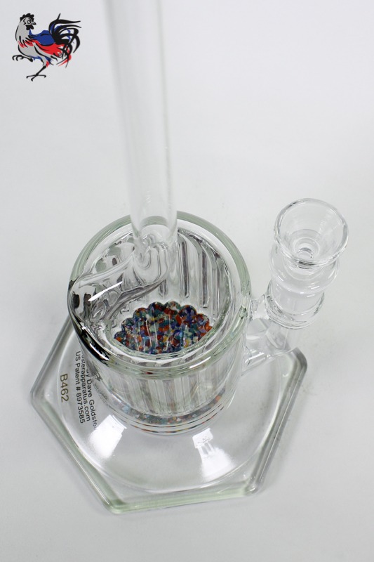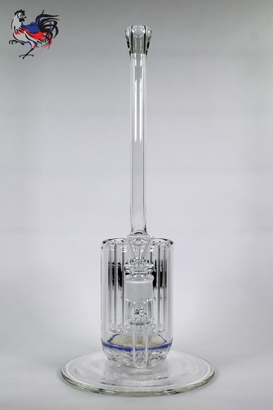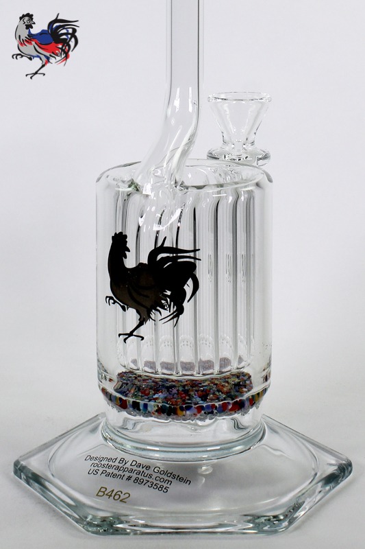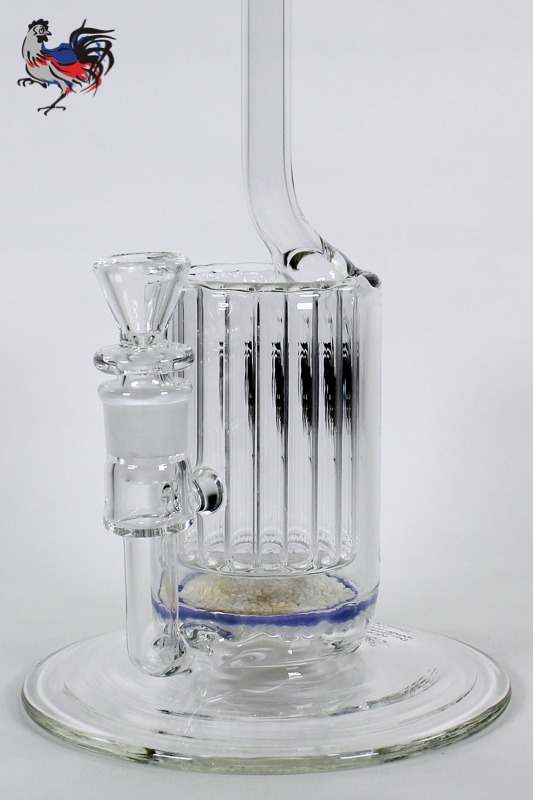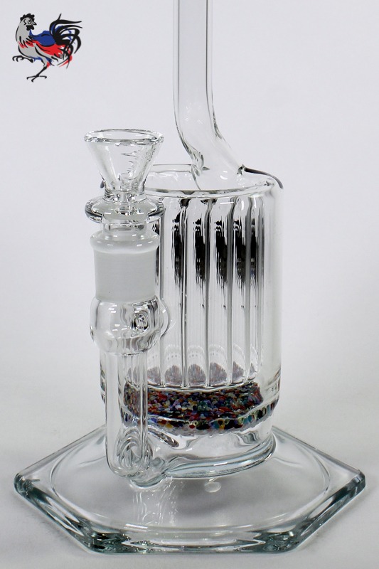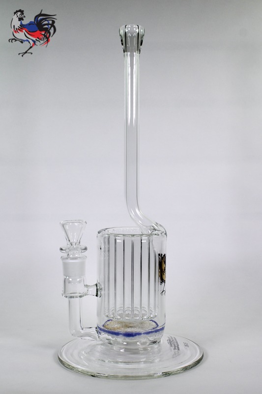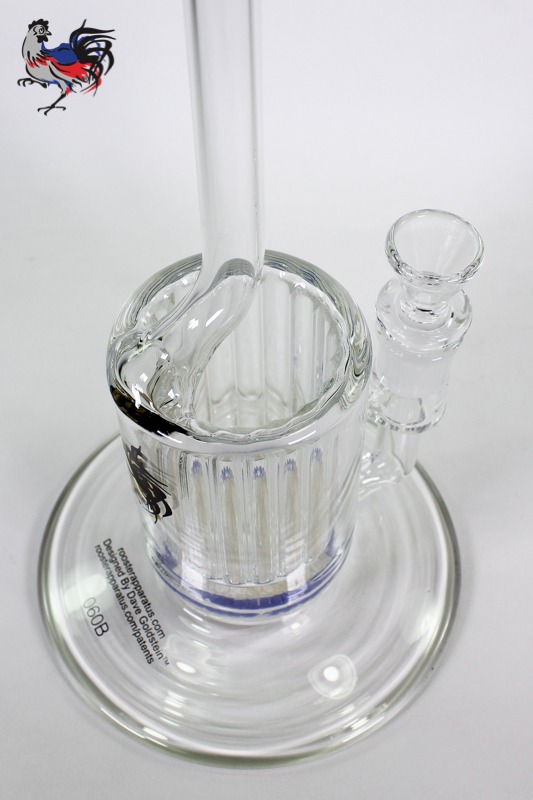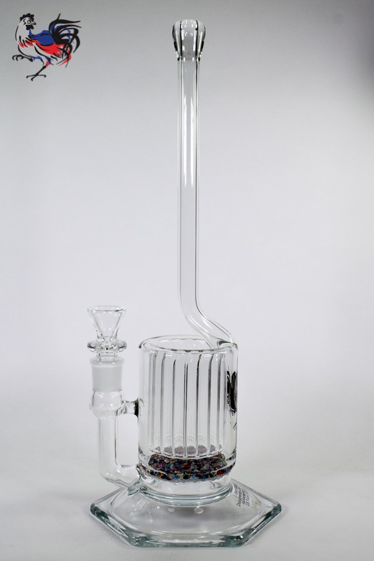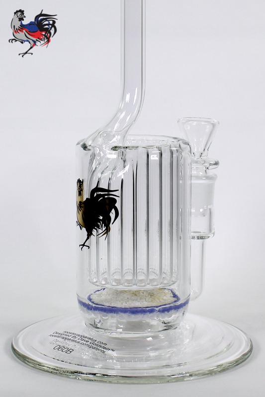 The Platinum Rooster is large in stature and incorporates an internal dewar style baffle to reduce internal volume. This provides a smoother hit without the harsh side effect of too much smoke. This model utilizes our 65mm fritted disc for excellent diffusion and is configurable with a 1000ml hex foot or a round foot.