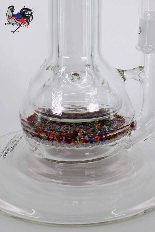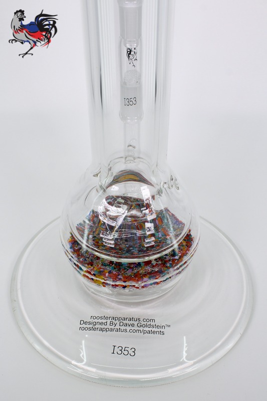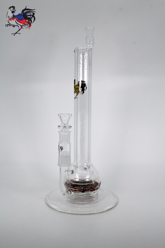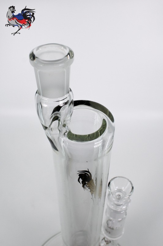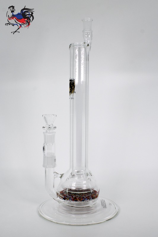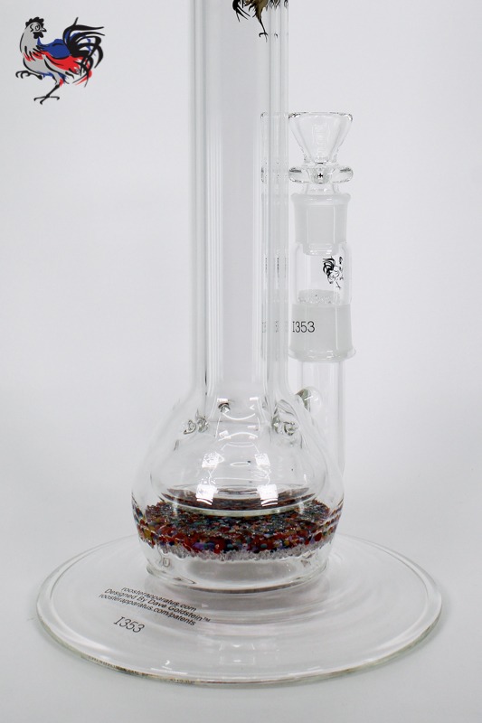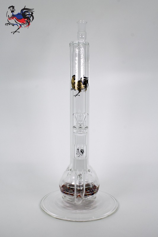 The Platinum Rooster is large in stature but incorporates an internal dewar style baffle to reduce internal volume. With a minimal internal volume of only 100ml, this piece is comparable to our smallest concentrate pieces at delivering payload. This provides a smoother hit without the harsh side effect of too much smoke. This model utilizes our largest 88mm fritted disc for maximum diffusion and a large flared foot for a rock solid stance.
