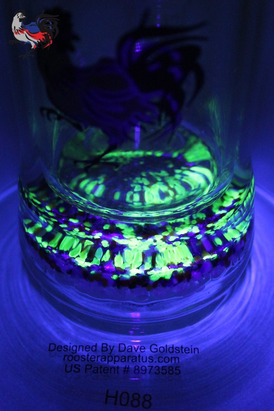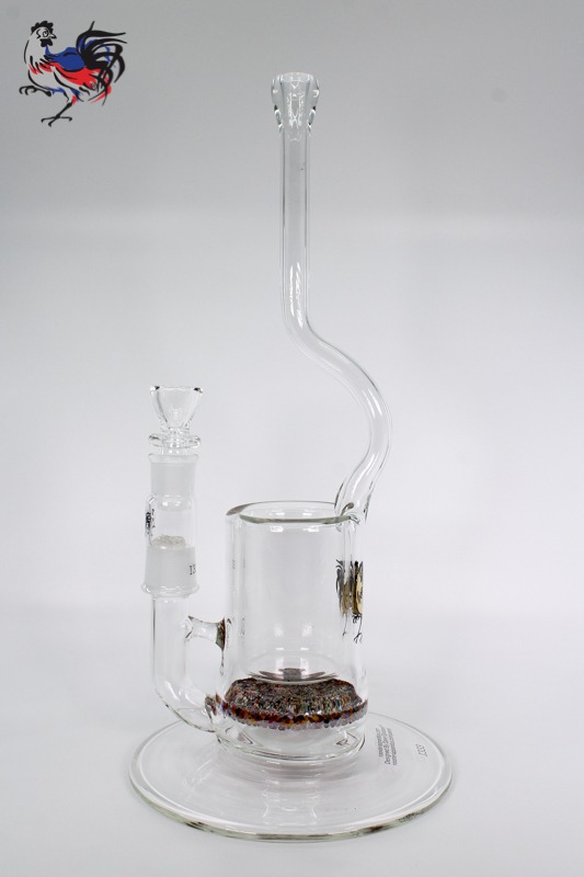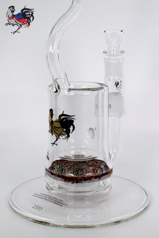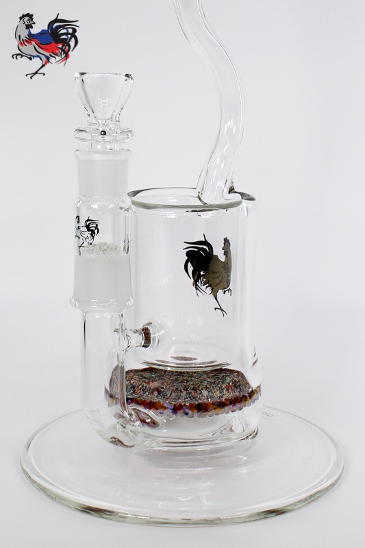 The Platinum Rooster is large in stature but incorporates an internal dewar style baffle to reduce internal volume. This provides a smoother hit without the harsh side effect of too much smoke. This model utilizes our largest 88mm fritted disc for excellent diffusion and a flared foot for a rock solid stance.